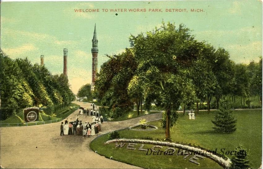Color postcard depicting a floral "Welcome", floral clock and several pedestrians in Water Works Park, with the tower and two smokestacks in the background.