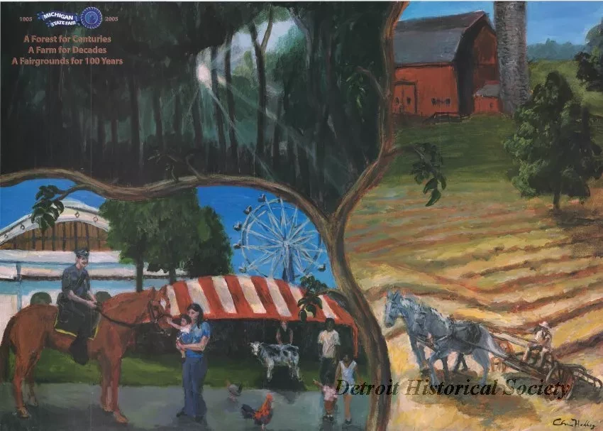 1 - Advertisement poster for the "2005 Michigan State Fair", the poster shows a color drawing with scenes of an old forest, a farm, and the modern fairgrounds. A caption in the upper left corner area shows "A Forest for Centuries, A Farm for Decades, A Fairgrounds for 100 Years." The name of the artist, "Chris Hadley," is shown in the lower right corner of the drawing.