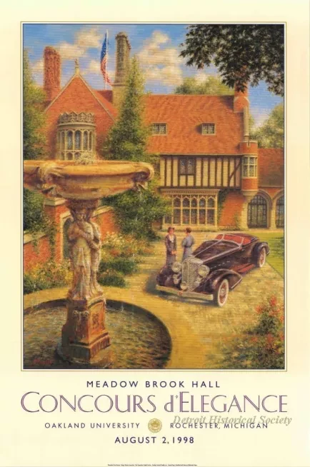One advertisement poster for the Annual "Concours d'Elegance" held at Meadow Brook Hall on August 2, 1998. The poster shows an Impressionist-style color drawing of a courtyard area at Meadow Brook Hall. A large fountain is shown in the left foreground. The Hall, a parked antique automobile and two women can be seen in the background. The name of the artist, Peter Hearsey, is shown in the lower left corner of the print.
