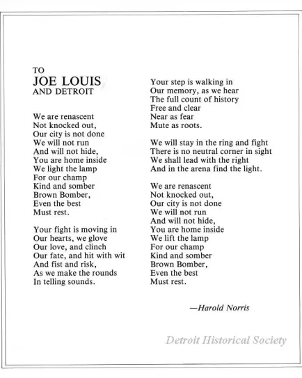 White poster printed with the poem "To Joe Louis and Detroit" written by Harold Norrris.