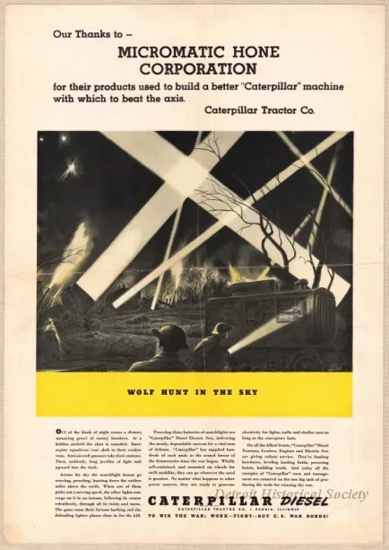Advertisement poster from Caterpillar Tractor Company with the message, "Our Thanks to - Micromatic Hone Corporation for their products used to build a better 'Caterpillar' machine with which to beat the axis." The poster features a drawing entitled, "Wolf Hunt In The Sky," that shows soldiers operating searchlights to locate enemy aircraft at night. A Caterpillar Diesel generator can be seen in the right foreground which is supplying the electricity for the searchlights. The artist's last name, "Stahl," is shown in the lower right corner of the drawing. Printed text along the bottom of the poster discusses the utility of Caterpillar Diesel products made by "Caterpillar Tractor Co., Peoria, Illinois."