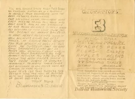 Pricelist, printed on paper, for Bloomgarden and Ellenstein Wholesale Fruits and Produce, dated August 22nd, 1894. The front cover features the header "Quotations," followed by the logo for Bloomgarden and Ellenstein. Underneath the logo and company name is a list of fruits and produce, including peaches, pears, plums, grapes, apples, and melons. The Office and Warehouse location is listed as "44 Griswold Street Detroit Michigan." Text underneath the address reads "These quotations are issued in the interest of shippers of all kinds of fruit with prices made from actual sales on day of issue, which date will be found on the next page." At the bottom of the cover is text reading "References: Peoples Savings Bank Detroit. Dun's and Bradstreets Mercantile Agency. Any Jobbing House in Detroit."