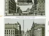 Print containing three engravings, taken from the booklet, Souvenir of Detroit & Exposition, depicting sites in downtown Detroit. The top is captioned "Jefferson Avenue south from Woodward." A streetcar, perpendicular to the tracks is in the center of the road. "James Nall, Carpets" is printed on a building on right side of the street. Set into this image is one of the Chamber of Congress within a frame drawn to resemble a piece of paper hung with nails. The bottom image is captioned, "Griswold Street from Jefferson Avenue." The Campau Block on the west side of Griswold and the Newberry and McMillan Building on the east side are both labeled. A moonlight tower and the spire of City Hall are both visible in the background. Pedestrians and horse-drawn carriages are in the street.