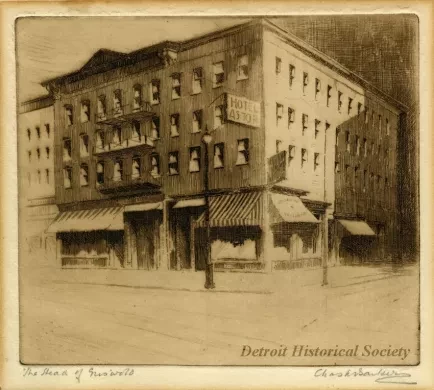 Black and white etching entitled "The Head of Griswold," depicting the northwest corner of Griswold and Jefferson c.1890-1900. The building on the corner has a sign reading "Hotel Astor." The title of the etching is indicated on the lower left corner and the bottom right corner is signed "Charles A. Barker."