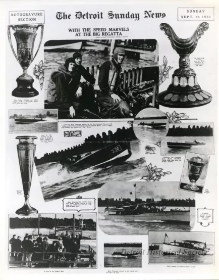 Black and white photo of the cover page of the Rotogravure section of the Detroit Sunday News for Sunday, September 26, 1920. Pictured is a collage of photos including trophies and race boats. The verso is marked, "Miss AMERICA I, 1920 Gold Cup winner, featured in newspaper spread."