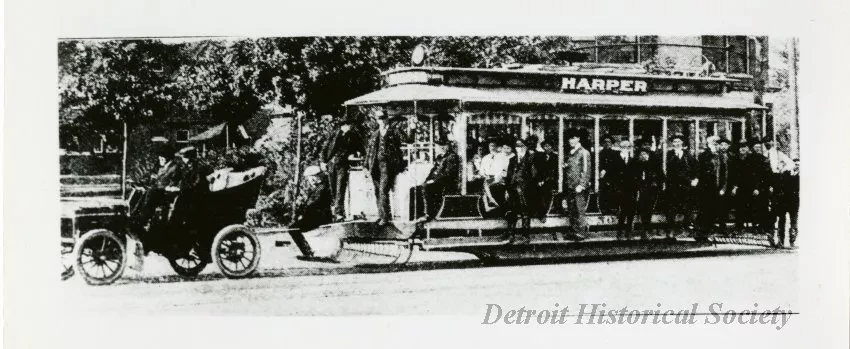 Half-tone black and white photo of an early automobile towing Detroit United Railway streetcar number 507, assigned to the Harper route. Passengers and conductors pose on the streetcar. "Detroit United Ry. #507," is stamped on the verso.