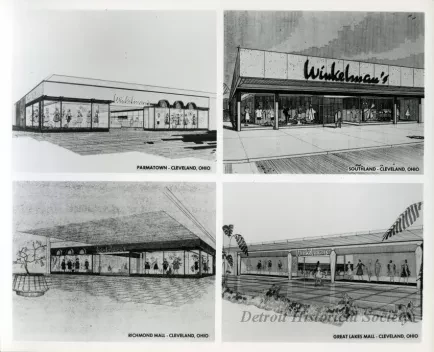 Black & White photographic print with architectural renderings of four Winkelman's stores in Ohio: #42 at Parmatown in Parma, #51 at Southland Shopping Center in Middleburg Heights, #8 at Richmond Mall in Richmond Heights , and at Great Lakes Mall in Mentor.
