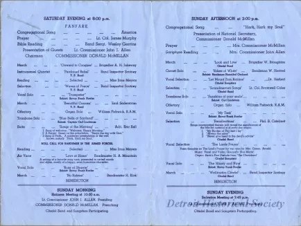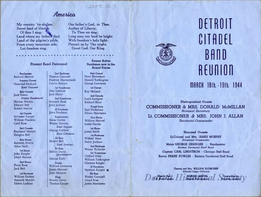 Half-folded program booklet for the Salvation Army's Detroit Citadel Band Reunion concert held on March 18th and 19th, 1944. The pieces to be performed are listed within, and active band members, as well as those away in the armed forces are listed on the back.
