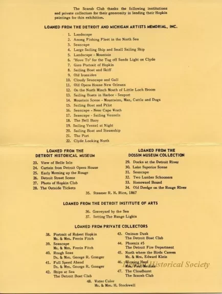 Half-folded program for an exhibit of Robert Hopkin paintintgs at the Scarab Club. Forty-eight paintings are listed within, on loan from Detroit and Michigan Artists Memorial, Incorporated; the Detroit Historical Museum; the Dossin Great Lakes Museum; the Detroit Institute of Arts; and several private collectors. A very brief biography of Hopkin is printed on the back.