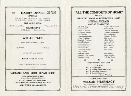Half-folded program for a production of "All the Comforts of Home" at the Highland Park Y.W.C.A. Auditorium, presented by the WYM Players on February 13th and 14th, 1935. The cast are listed within along with advertisements for Harry Disner, the Atlas Cafe, the Farrand Park Shoe Repair Shop, Wilson Pharmacy, Shifman's, the Atlas Clothes Shop, the Plucer Drug Company, Walker Motors Incorporated, and Palmer's.