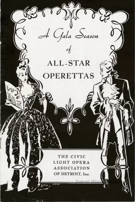 Program booklet for performances of "Hit the Deck" presented by the Civic Light Opera Association of Detroit at the Masonic Temple Auditorium during the eighth week of their 1944 season spanning February 29th to March 6th; front cover features a black and white illustration of a man and a woman dressed in 18th century costume; man has a walking stick and is looking at the woman, woman has a fan and is looking at the man; stand on either side of decorative text "A Gala Season of All-Star Operettas"; at bottom "The Civic Light Opera Association of Detroit, Inc." Information about the performance and advertisements are contained within.