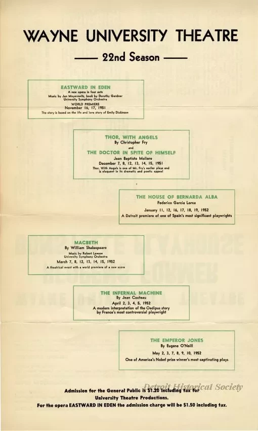 Program/announcement for Wayne University reopening Bonstelle Playhouse as part of their theatre program for the 1951-1952 season; beige paper with green lettering "Wayne University Theatre Reopened Former Bonstelle Playhouse;" the schedule within includes "Eastward in Eden," "Thor, with Angels," "The Doctor in Spite of Himself," "The House of Bernarda Alba," "MacBeth," "The Infernal Machine," "The Emperor Jones," "Aladdin and the Wonderful Lamp," "Billy Budd," and "The Firstborn."