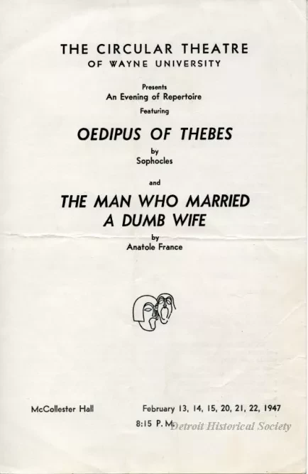 Half folded program for performances of "Oedipus of Thebes" and "The Man Who Married a Dumb Wife" on February 13-22, 1947 at the Wayne University's Circular Theatre in McCollester Hall; program is black and white; top of front cover says "The Circular Theatre of Wayne University" followed by performance information, venue, and dates; below listed plays, illustration of the two masks of comedy and tragedy; cast and crew are listed within.