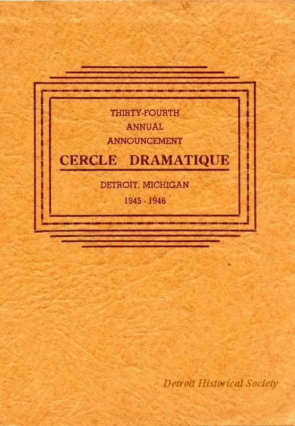 One program booklet entitled "Thirty-Fourth Annual Announcement, Cercle Dramatique, Detroit, Michigan, 1945-1946." The softcover program has a light brown heavyweight textured paper cover with dark brown title text. It contains 12 pages of dark brown printed text on white paper which show the monthly schedule of dramatic performances for the upcoming season from October through May. A typical agenda for monthly meetings is also shown. In addition, the booklet lists the names of club officers, board members, committee members, and members along with an "In Memoriam" section which lists the names of deceased members.
