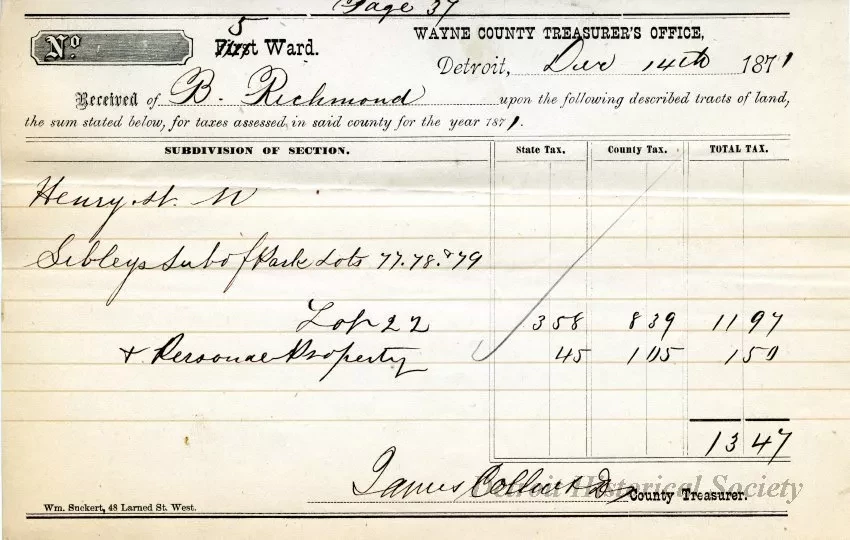 One tax receipt, dated December, 14, 1871, issued by the Wayne County Treasurer's Office in Detroit. It was printed in black text on white paper and indicated that B. Richmond paid $13.47 for state and county taxes on property located at Henry St. W, namely, "Lot 22 & Personal Property." The receipt was signed by "James Collins, D. [Deputy] County Treasurer."