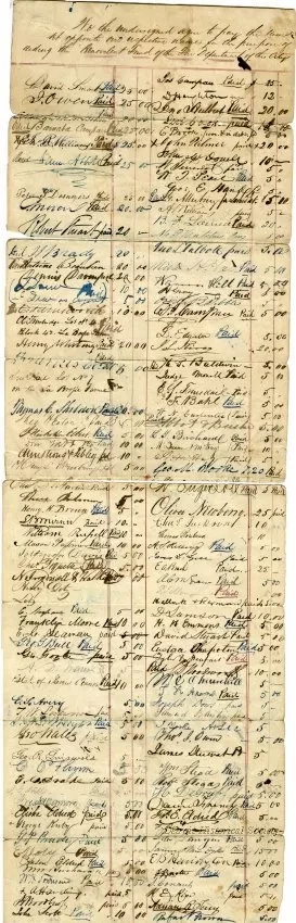 Handwritten list of contributors' signatures and monetary pledges to the Benevolent Fund of the Fire Department. The list takes up two columns along the entirety of the recto, and two columns on a portion of the verso.