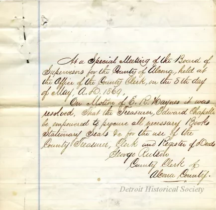 One resolution, dated May 8, 1869, that was issued by the Board of Supervisors of Alcona County, Michigan. It was handwritten in black ink on white paper that has light red and blue lines and columns. The resolution directed the treasurer to obtain the stationery and record books that would be necessary for the various county government offices. A list of record books and prices is attached on a second page with the heading, "Memorandum of Prices for Oceola [Osceola] & Alcona County."