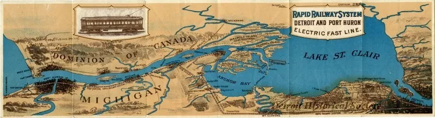 Six panel parallel folded Detroit and Port Huron Electric Fast Line time table and map. The recto includes times for interurban streetcars between Detroit and Port Huron, effective July 18, 1905, as well as times for cars between Detroit and Mt. Clemens aboard the Shore Line Interurban. The verso is printed with a color map expanding across all six panels, credited to the Calvert Lithographing Company, showing the routes of both lines as well as highlighting cities, hotels, and landmarks along both sides of Lake St. Clair, and the St. Clair River. Streetcar number 102, the "Miantonoman" is pictured in an insert in the map.