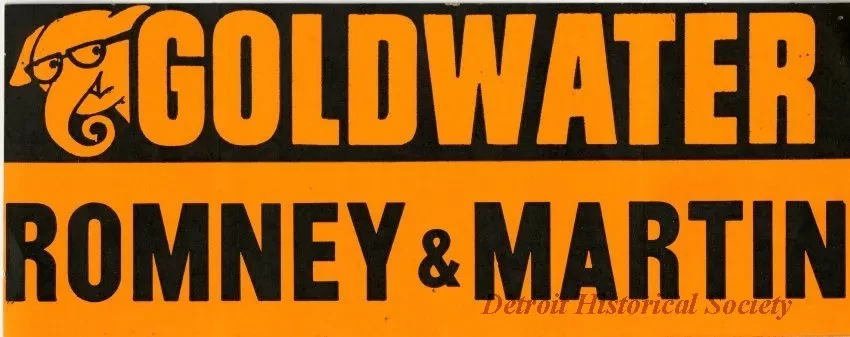 Bumper sticker for the Republican Party candidates for President of the United States and Governor of Michigan for 1964. Top half reads "GOLDWATER" in orange text on a black background, with an illustration of an elephant to the left. Bottom half reads "ROMNEY & MARTIN" in black text on an orange background.