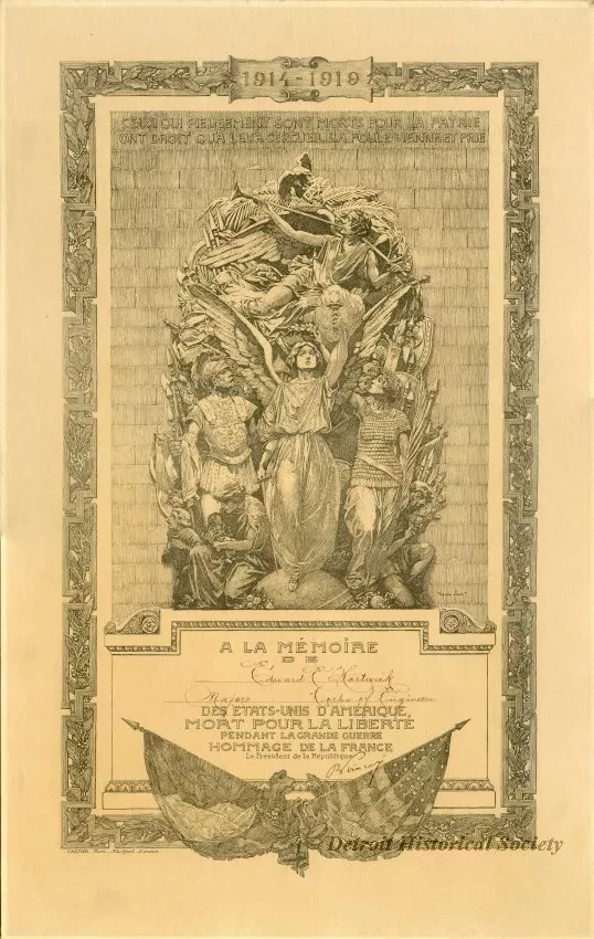 1 - Testimonial to Edward E. Hartwick in French in the form of an etching: "A La Memoire De Edward E. Hartwick Major Corps of Engineers, Des Etates-Unis D"Amerique, Mort Pour La Liberte Pendant La Grande Guerre Hommage De La France, La President de la Republique"; signed Cartier Paris New York London.