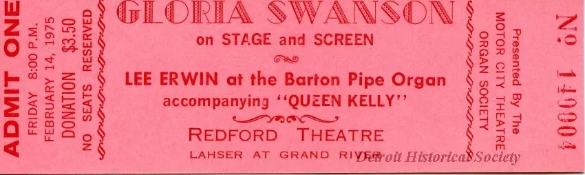 Ticket for a screening of "Queen Kelly," at the Redford Theatre with star Gloria Swanson in attendance, and with an accompaniment by Lee Erwin on the Barton Pipe organ, presented by the Motor City Theatre Organ Society, on February 14, 1975; Donation $3.50; pink ticket; No. 140004.
