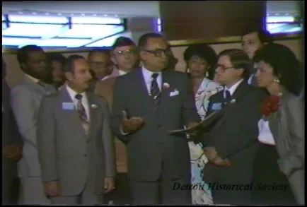 U-Matic S tape containing footage of Mayor Coleman A. Young giving a presentation at the Renaissance Center on July 11, 1985, as part of the Neighborhood Shopping Days campaign spanning July 18th to the 21st. The tape opens with the City of Detroit Department of Public Information Video Production logo. Afterward Mayor Coleman A. Young is shown surrounded by representatives of neighborhood shopping areas. He discusses the importance of neighborhood merchants, and urges people to shop in their neighborhoods. He lists some of the shopping districts participating in the campaign: Bagley Avenue (Mexicantown), Civic Center East (Kelly/Whittier/Hayes), Dexter-Davison, East Warren Avenue-Outer Drive, Grand Green, Gratiot Avenue-Seven Mile Road, Livernois Avenue-Seven Mile Road, Redford Is (Grand River Avenue and Lahser Road), Vernor Junction, Vernor-Springwells, and Virginia Park. After the footage, the Four Tops' "Be a Part of the Heart of Detroit (Do It In Detroit)'' plays against a black screen.