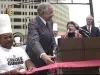 The chefs are then joined by Young, as the crowd counts down for the ribbon cutting. After the ribbon is cut, balloons are released, and the camera follows them as the fly up beside the Fisher Building.