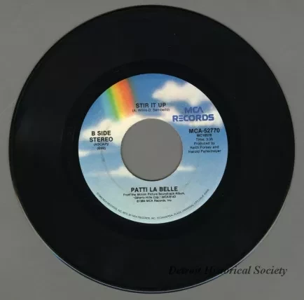 Patti LaBelle "On My Own" featuring Michael McDonald/"Stir It Up" 45 RPM single, released by MCA Records. "Stir It Up" was co-written by Allee Willis. The record has a MCA Records label, and a sleeve both with a blue sky and rainbow motif. A jukebox label is included inside the sleeve.
