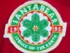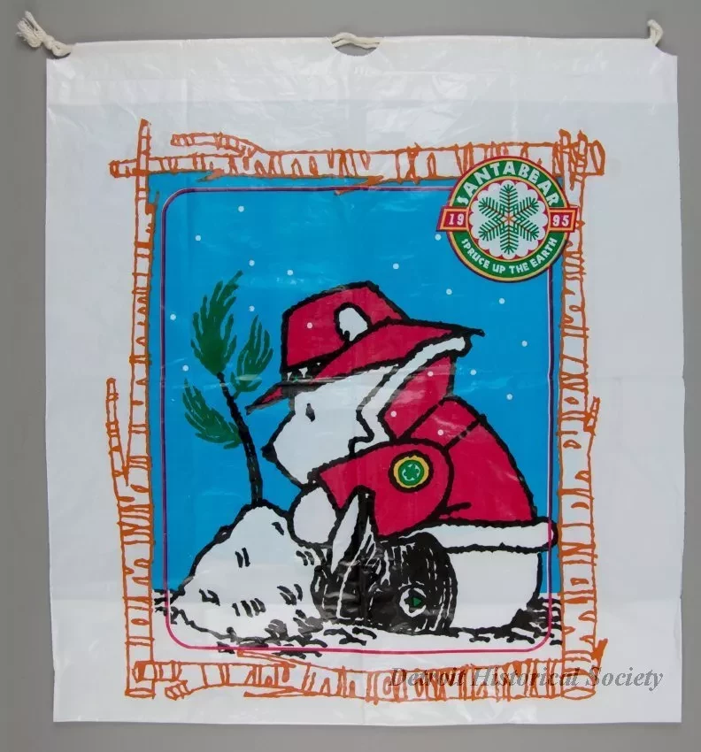 One Santa Bear stuffed animal which was sold as a promotional item by the Dayton Hudson Company as part of their 1995 Christmas holiday marketing campaign. The teddy bear toy is made of white polyester fiber with black plastic eyes and a black plastic nose. It is wearing a red felt western style hat with a red/green/white tree pattern headband. It is also wearing a red fabric jacket that has two metal snaps at the center front and is trimmed with simulated sheepskin along the collar, cuffs, and bottom edge. A multi-color embroidered patch on the left sleeve has white text that reads "Santabear, 1995," and "Spruce Up the Earth." Inside the back of the jacket, there is a small illustrated book entitled "Santabear Conservation Corps Log Book, 1995." A small pair of black plastic binoculars is hanging around the neck in front from a black cord. A white fabric tag on the underside has black text that shows the manufacturer's name, address, material description, and registration details. The bear comes with a white plastic bag that is printed with multi-color images of Santabear on the outside and has a white drawstring at the top.