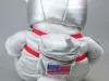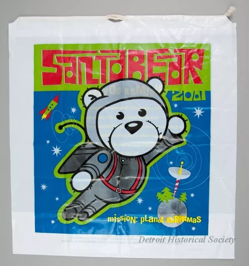 One Santa Bear stuffed animal which was sold as a promotional item by the Dayton Hudson Company as part of their 2001 Christmas holiday marketing campaign. The teddy bear toy is made of white polyester fiber with black plastic eyes and a black plastic nose. It is wearing a silver-colored fabric helmet and a matching space suit that has two metal snaps at the collar and a long diagonal zipper down the front. A label on the collar reads "Santabear," and a multi-color embroidered patch on the right sleeve reads "Mission: Planet, Christmas, 2001." Also included is a matching silver-colored fabric backpack that has red shoulder straps and an embroidered American flag patch on the back. A paper tag on the left ear shows a price of $38.50. Also, a white fabric tag on the underside has black text that shows the manufacturer's name, address, material description, and registration details. The bear comes with a white plastic bag that is printed with multi-color images of Santabear on the outside and has a white drawstring at the top.