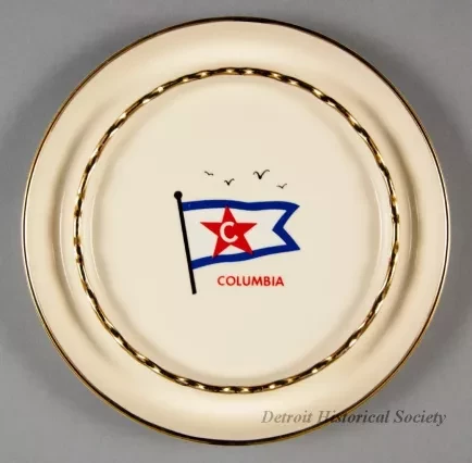 One ashtray used as an advertisement giveaway. It promoted the steamships of the Columbia Transportation Division of Oglebay Norton Company. The large circular ashtray is made of heavyweight glazed china of a bone/ivory color. It has short curved sides with a rounded top edge and a short circular base. The ashtray includes an inner circular ridge with 22 evenly-spaced notches for holding cigarettes. The top edges of the outer and inner circles are each painted with narrow gold-colored stripes. A red/white/blue image of the company house flag is painted on the flat bottom at the center of the ashtray along with red text that reads "Columbia." No manufacturer's name or marks are shown.