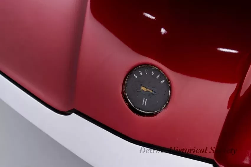 Prototype of the Ford Cougar II, a red fastback two-door coupe designed by designed Eugene Bordinat and built on a Shelby Cobra chassis (CSX2008), powered by a production 289 cu-in V-8 engine, and equipped with a 4-speed manual transmission. The car has a metallic cherry-red paint with an all-black interior of black leather upholstery. The top panel is painted gray.