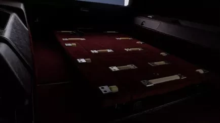 1987 Cadillac Hearse automobile, custom made by the workers at the Fleetwood plant in 1987. The hearse has an all black exterior with a landau roof and bar. The maroon plush seats fold down and there is a platform with rollers to slide the casket into the back of the car.