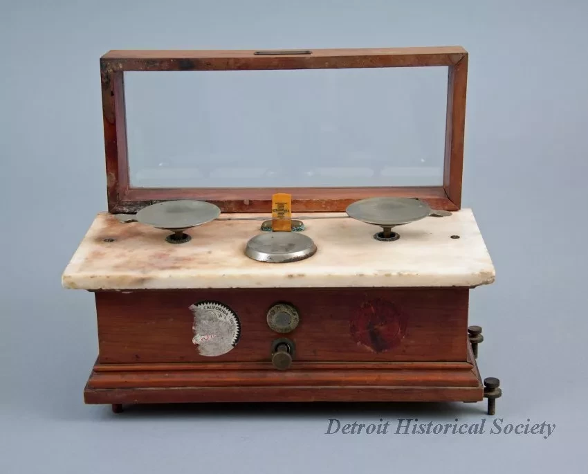 One apothecary/pharmaceutical balance. The balance case is made of fine-grained wood that has been finished with medium brown stain and a clear lacquer or varnish. It has a hinged glass top cover with a wood frame and decorative moldings along the base. Two metal balance arms with removable circular pans as well as a graduated scale are located on the white marble top surface of the case beneath the glass. A rectangular metal manufacturer's label on the front reads "Henry Troemner, Maker, Philadelphia, PA.," and "Cap. 1 Oz., No. 120.C.B., Made in U.S.A." A circular metal inspection tag on the center front has stamped text that reads "Penna. & N.Y.C. App'd Type 17, Serial W2." Two State of California adhesive inspection seals, dated 1956 and 1932, are also located on the front of the case. A metal adjusting knob for balance calibration is located beneath the circular tag. The underside of the case has two short fixed legs on the left side and two short adjustable screw-type legs on the right. The balance arms and pans are made of brass which has a chrome or nickel silver finish. The calibration knob and adjustable legs are made of brass.