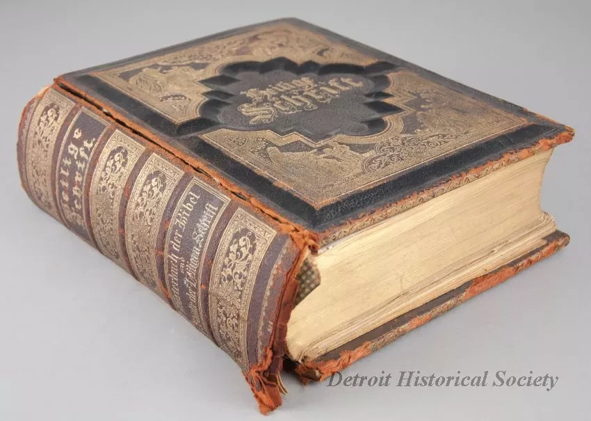 One Bible from St. James Lutheran Church, Detroit. It has a thick black leather cover with a decorative, depressed area at the center which has gold colored title text that reads "Heilige Schrift [Holy Scripture/Bible]." Decorative gold-colored drawings at the four corners show Bible figures along with references to scriptural text from the Books of Kings, Luke, Mark, and Samuel. The title, "Heilige Schrift," is also printed on the spine in gold-colored text along with decorative gold-colored designs. The front pages show an engraved image of Martin Luther as well as a discussion in English about the traditions of "The Family Bible." This Bible was published by A. J. Holman & Co. of Philadelphia and has a copyright date of 1904. The remaining pages are printed in German fraktur script on white paper. Several pages are included at the back for family photographs. A handwritten note on the front end page reads "This Bible was used in St. James pulpit by Dr. Bergener. It was replaced in the late nineteen thirties."