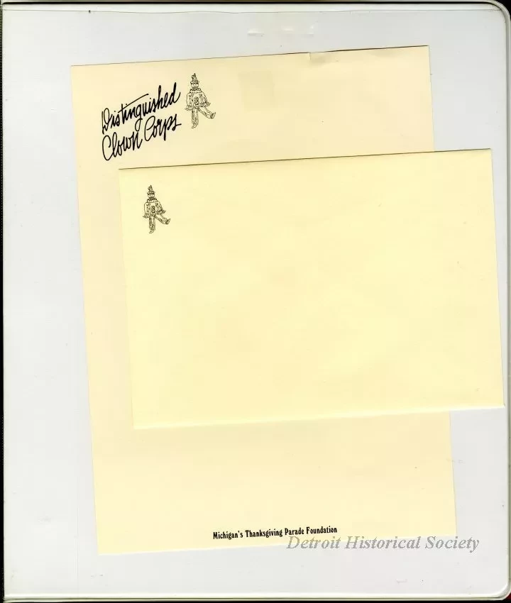 One 3-ring binder containing informational materials about the "Distinguished Clown Corps" of the Detroit Thanksgiving Day Parade. The binder has a white vinyl hardcovers with a clear window pocket on the front that contains two pieces of Clown Corps stationery (one letter and one envelope). The binder contains 18 sheets of black paper that have clear acetate protective covers. Sample pieces of stationery, clown recruitment letters, donation forms, and photos are arranged in a presentation format and glued onto both sides of the black paper sheets. Two separate "Distinguished Clown Corps, Clown Recruitment Kit" folders are located at the back of the binder. The folders include pieces of blank stationery, clown recruitment instructions, and parade buttons. Materials in the binder are dated from 1984 to 1986.