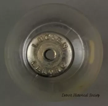 Perfume Bottle. Long narrow-necked bottle with a spherical body topped with a silver-colored metal ball stopper. Features silver paper around the entire neck, printed on the label are parallel horizontal lines, along with, "Lucien LeLong / Eau de Cologne." Verso of the label is a rectangular design and states, "Contents / Approx. 2 1/2 oz." The silver-colored metal mouth liner is stamped "Lucien Lelong."