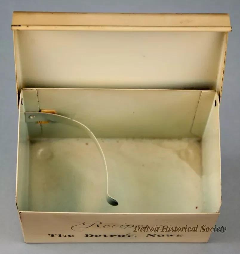 One Detroit News recipes box. The rectangular box is made of thin steel which has a tan enamel paint finish. The top is hinged at the back and the front has black painted text that reads "Recipes, The Detroit News." A strip of curved steel is mounted inside the box to provide a spring mechanism for holding recipe cards upright.