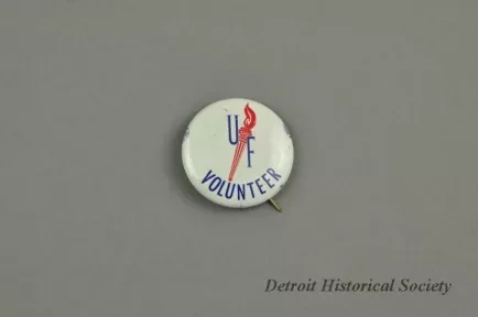 Volunteer button for the United Foundation Torch Drive. The button has a red torch in the center with the U and F on each side. Along the bottom center it states "volunteer".