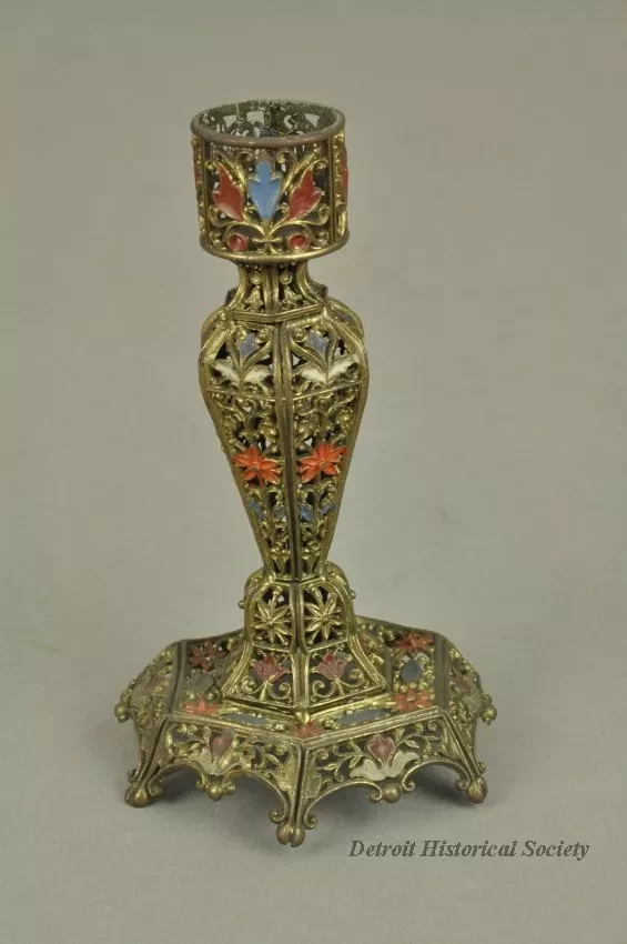 Openwork brass and enamel candlestick with floral motif and six feet. Made in Morocco.