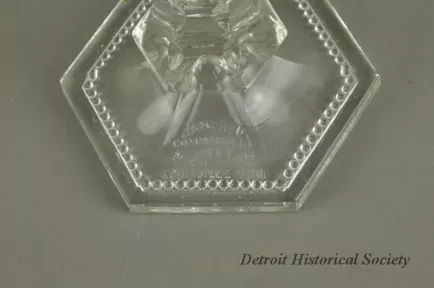 Clear glass candlestick with hexagonal base and stem. Made for the Tancred Commandery No. 48 Knights Templar of Pittsburgh, PA to commemorate their trip to the 28th Triennial Conclave in Louisville, KY on August 27-29, 1901.