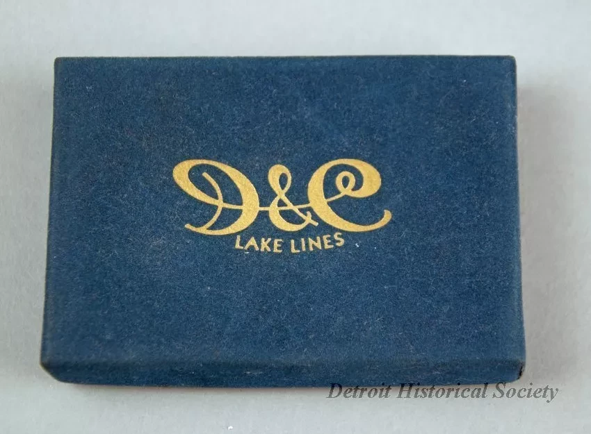 One deck of "D&C Lake Lines" playing cards. The unopened standard deck of playing cards is wrapped in clear plastic and the top card shows an image of the passenger steamship, SS Greater Detroit, of the Detroit & Cleveland Navigation Company. An Internal Revenue tax stamp is affixed to the wrapper. The deck is contained in a cardboard box. The exterior surface of the removable lid is covered with dark blue velvet and the bottom exterior is covered with silver-colored paper. A printed label on the bottom of the box reads "Redi-Slip Finish, Remembrance Playing Cards."