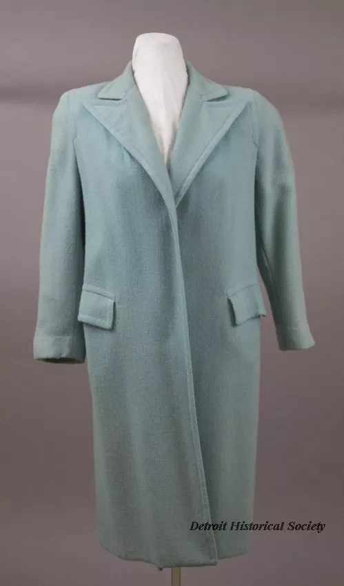 Woman's light blue wool coat. The coat has a notched collar with wide lapels, padded shoulders, straight long sleeves with plain cuffs, flap pockets on each hip, no front closure, a center vent at the back, a blue acetate lining, and a knee-length hemline.