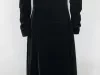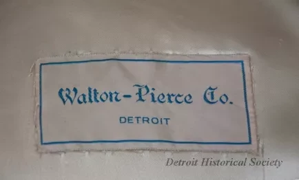 One lady's black velvet evening coat. The coat has a "Peter Pan" collar that is edged with white fur and long sleeves that gather at the shoulder and taper to the wrist. The coat has two velvet button closures, one located at the collar and one located at the waist. The back of the coat is princess cut. The interior is lined with white silk and includes the label "Walton Pierce, Detroit," located at the interior center collar.
