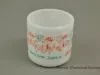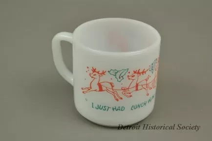 1 mug. white glass with design in red and blue of Santa Claus and reindeer, blue letters: "I just had lunch with Santa at Crowley's", raised letters on bottom "Heat proof F U.S.A. 28"