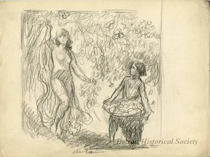 Pencil sketch drawn by Charles E. Waltensperger on beige paper of a woman in a diaphanous gown with her arms outstretched amid foliage, standing beside a woman holding a large bowl-shaped basket of fruit. "Autumn," is handwritten beneath the sketch.
