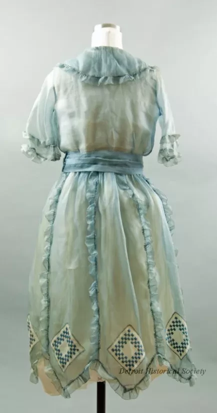 One lady's summer dress made of light blue and white organdy cotton. The "Little Bo Peep" style dress has a wide, light blue collar with a V-front and ruffles along the edges. It has elbow length sleeve with ruffles on the cuffs. The lower part of the skirt has vertical panels that are divided by vertical lines of ruffles all the way around. One blue and white embroidered check square has been appliqued in the bottom center area of each skirt panel. A calf-length, white under-dress of white organdy fabric shows in front and has a hemline slightly below the outer blue fabric. Ten small fabric-covered false buttons are located on the front of the under-dress in a single row beneath the neckline. The back panel and straps of the under-dress are made of white netting with picot edges. Snap closures are located at the left waist. A blue cummerbund-style belt fastens on the left side with snaps. No manufacturer's labels are shown.
