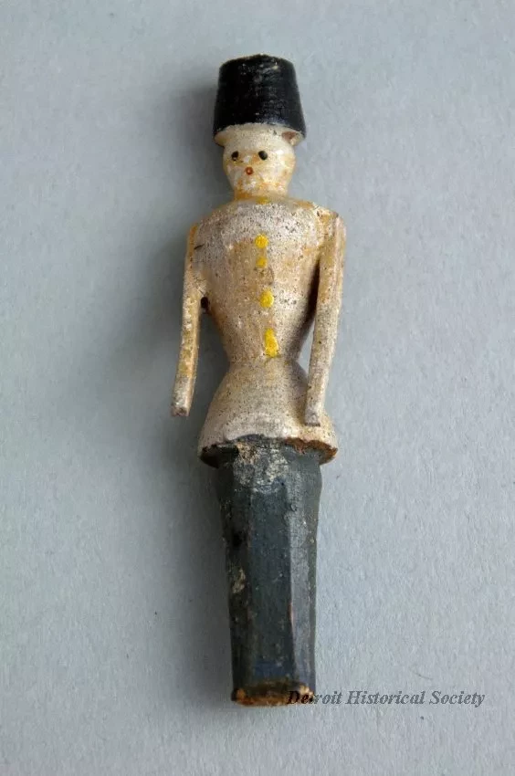 Request ImageOne wooden soldier figure carved from a single piece of wood. Has black frustum-shaped hat, gray tunic, dark gray pants, and remnants of yellow paint on body.