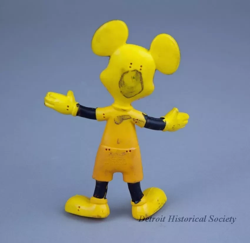 Mickey Mouse doll figure made of soft plastic. Shoes, gloves and shirt are painted yellow. Has red pants, pink face, black arms, legs and ears. Stamped "Walt Disney Productions Mfg. for Lakeside Ind. Inc., Made in Hong Kong."