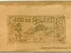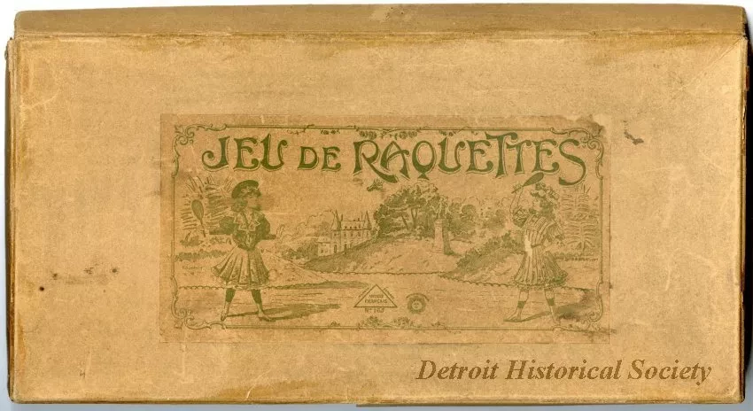 A French boxed badminton set, entitled "JEU DE RAQUETTES." The box is brown and features and illustration of two girls playing badminton in front of a castle and trees. The contents of the box includes two small rackets with black tape handles and two shuttlecocks made of white feather cork.